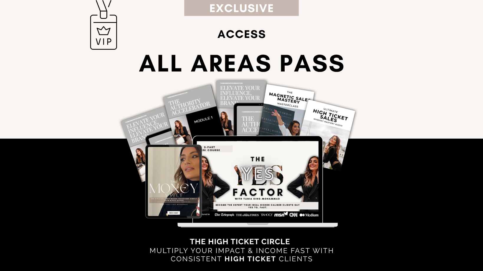 ✔ Access All Areas Pass to every live core high-ticket sales and business programme so you master premium positioning, messaging, and consistent premium sales.
