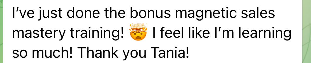 I love working with Tania. In the High-Ticket Circle, you get everything you'd expect - strategic support on offers, messaging, recurring income - but what makes it different is how she shows up with such powerful energy and motivation every single day.